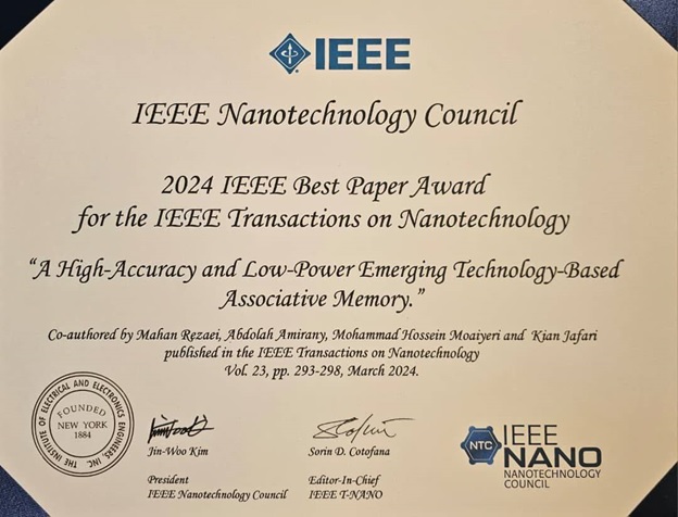 مقاله دکتر محمد حسین معیری موفق به دریافت جایزه بهترین مقاله سال ۲۰۲۴ مجله معتبر IEEE Transactions on Nanotechnology گردید