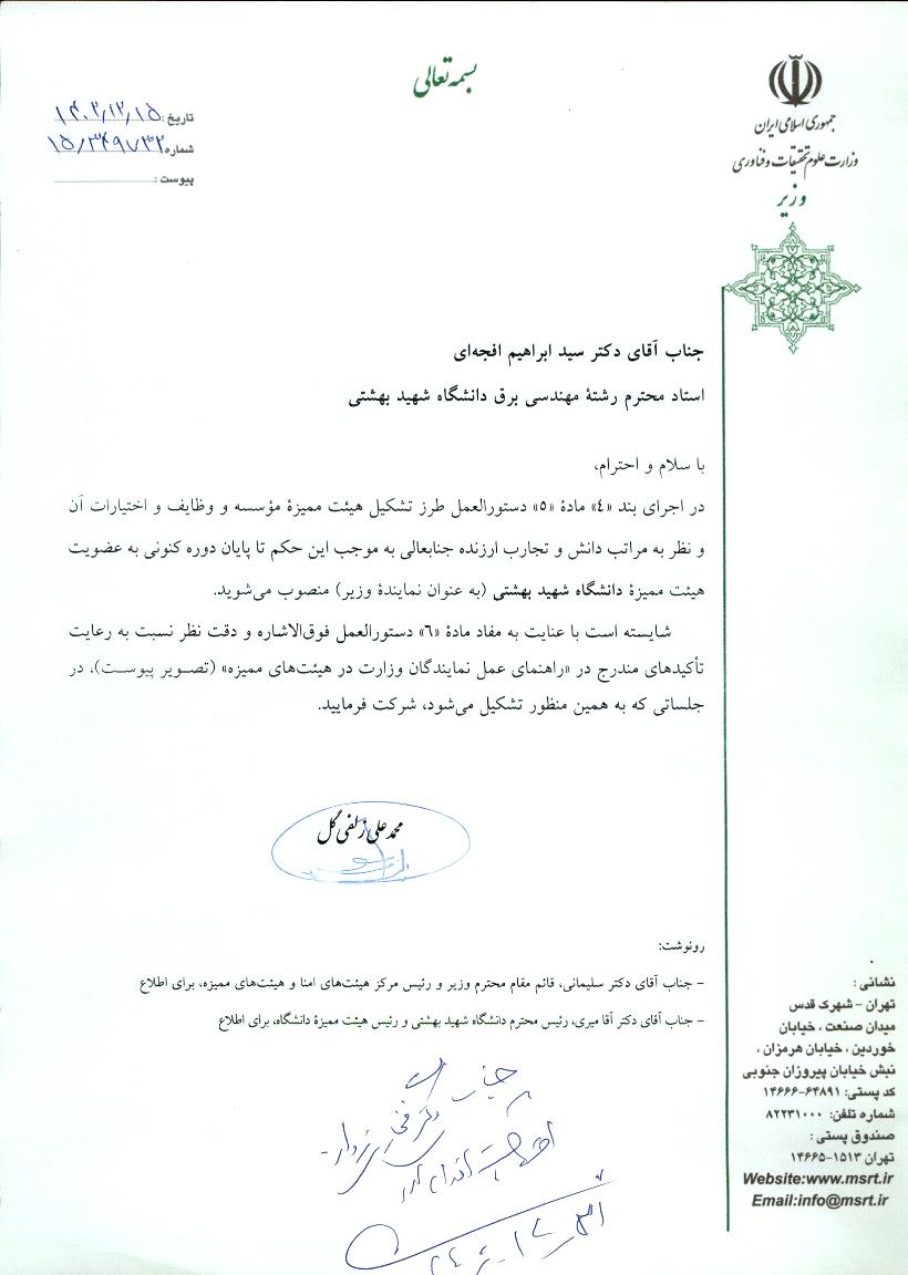 عضویت جناب آقای دکتر سید ابراهیم افجه ای در هیت ممیزه دانشگاه شهید بهشتی (به عنوان نماینده وزیر) وزارت عطف _وزیر محترم علوم،تحقیقات و فناوری _دکتر محمد علی زلفی گل
