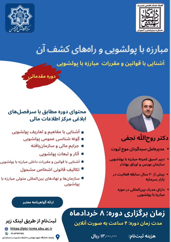 در صورتی که تمایل دارید در دوره مبارزه با پولشویی و راه‌های کشف آن که در دانشگاه شهید بهشتی به صورت آنلاین برگزار می‌شود شرکت کنید لطفا از طریق زیر اقدام فرمایید.