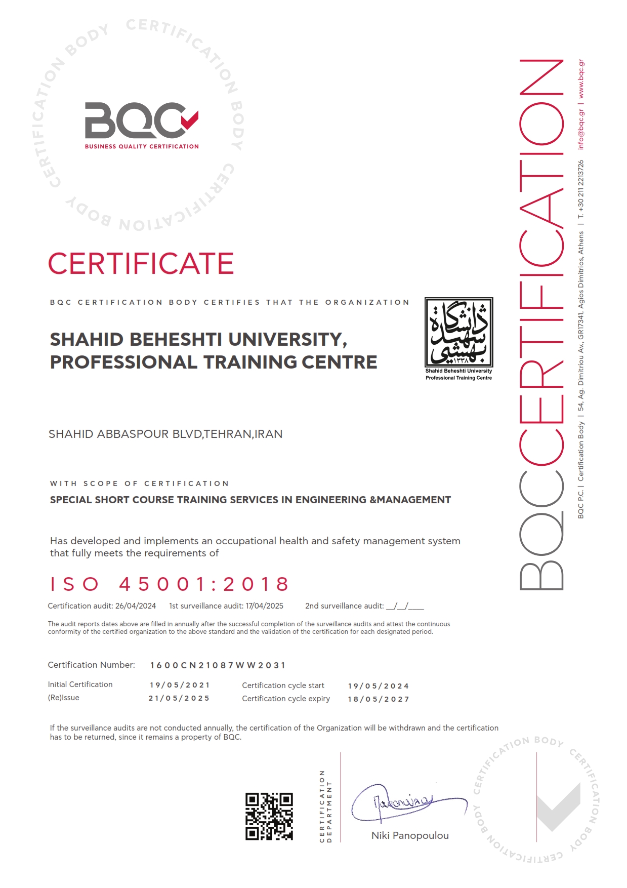 با این رویکرد و هم راستايي با الزامات و موازین چهار موضوع استاندارد ذیل، و بر اساس برنامه راهبردی پیامد گرا و خط مشي نظام مديريت يكپارچه ، هر ساله نسبت به برگزاري جلسات بررسی ارزیابی مميزي و تمديد اعتبار، با حضور نمایندگان موسسۀ گواهي دهندهBQC(Business Quality Certificate) و اعتبار دهنده ​​​​ESYD  (مستقر در اتحادیه اروپا) ،فعالیت هایی مستمرکیفی و اثر بخشی آموزشی ،  را در قالب اصلاح و بهبود روش های اجرایی و سامانه های نرم افزاری در ایجاد محیطی پویا و امن  معمول نموده است.