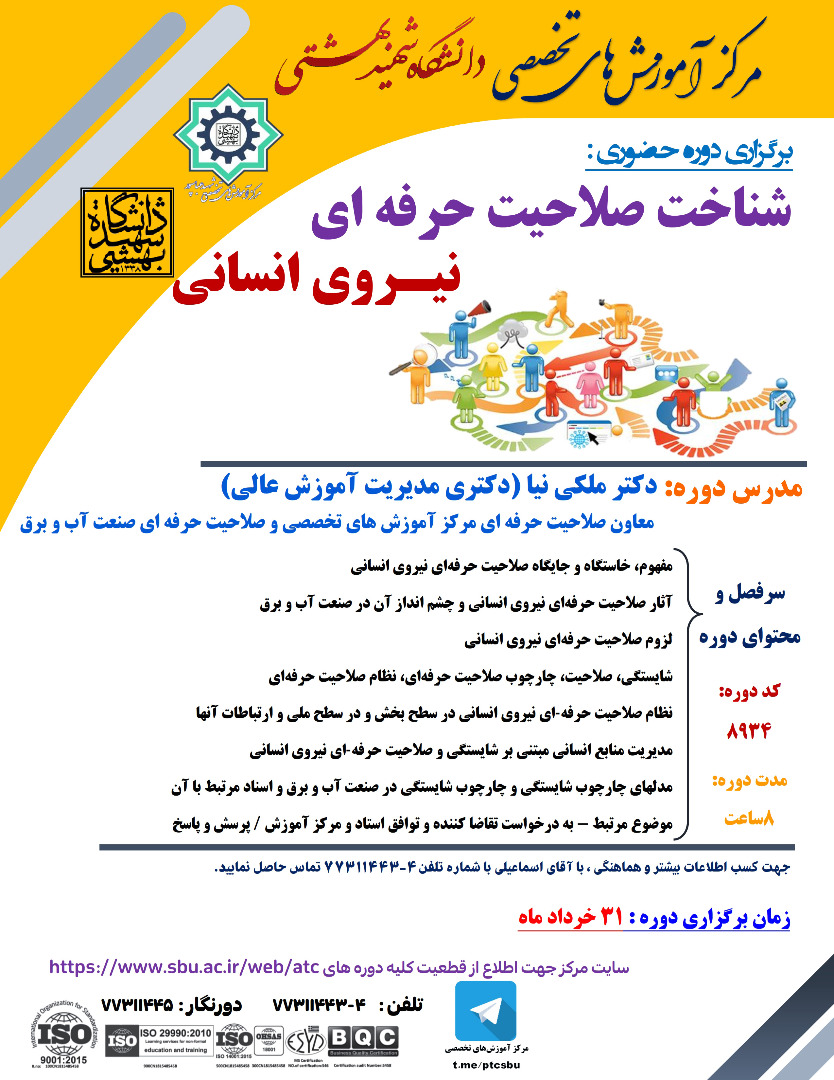 با توجه به استقرار نظام صلاحیت حرفه ای در سازمانها، مرکز آموزشهای تخصصی دانشگاه شهید بهشتی با هدف آشنایی با این فرایند اقدام به برگزاری دوره آموزشی " شناخت صلاحیت حرفه ای نیروی انسانی" نموده است.