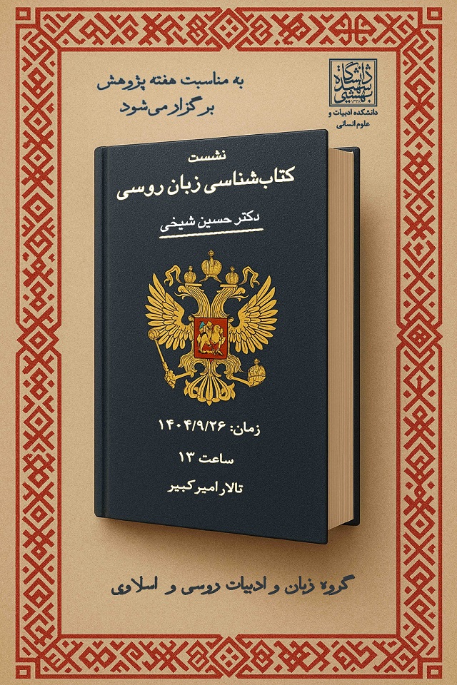 به مناسب هفته پژوهش، نشست کتاب شناسی زبان روسی توسط دکتر حسین شیخی برگزار می شود. جهت کسب اطلاعات بیشتر به پوستر رجوع شود: