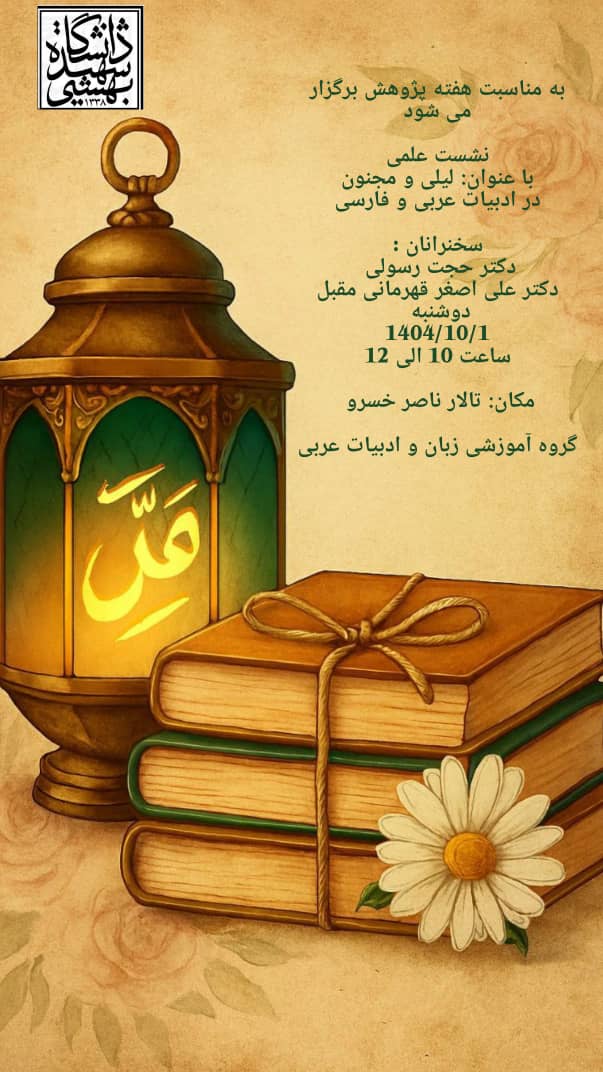 به مناسب هفته پژوهش، نشست علمی با عنوان «لیلی و مجنون در ادبیات عربی و فارسی» توسط آقایان دکتر حجت رسولی و دکتر علی اصغر قهرمانی مقبل برگزار می شود. جهت کسب اطلاعات بیشتر به پوستر رجوع شود: