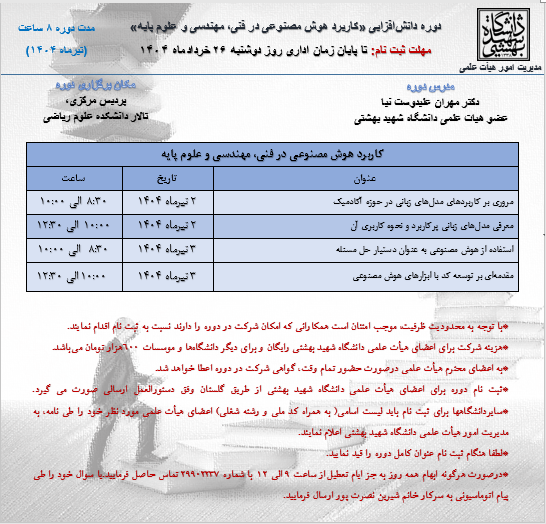 برگزاری دوره حضوری دانشافزایی «کاربرد هوش مصنوعی در فنی و مهندسی و علوم پایه»در تیرماه 1404