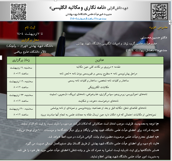 یادآوری می شود به اعضای محترم هیأت علمی در صورت حضور تمام وقت در دوره، گواهی شرکت اعطا خواهد شد.