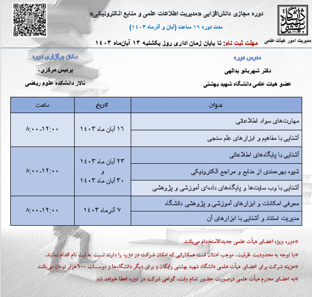 مدیریت امور هیأت علمی دوره دانش افزایی "مدیریت اطلاعات علمی و منابع الکترونیکی" را در آبان و آذر ماه 1403 برگزار کرد.