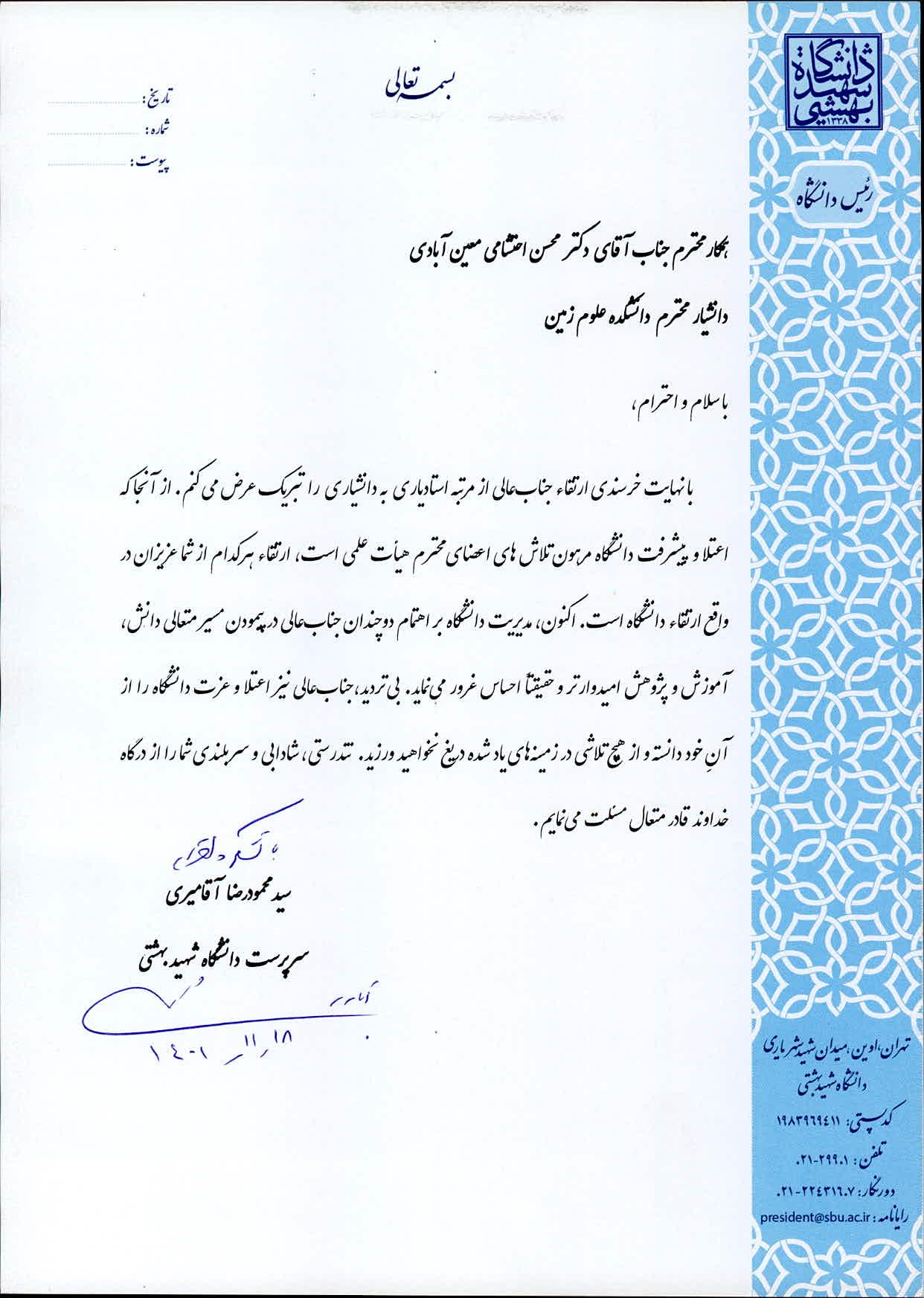 دکتر سید محمود آقامیری، رئیس دانشگاه شهید بهشتی، با ارسال پیامی ارتقاء مرتبه علمی دکتر محسن احتشامی معین آبادی، عضو هیات علمی دانشکده علوم زمین را از مرتبه استادیاری به دانشیاری تبریک گفت. متن پیام به شرح زیر است: